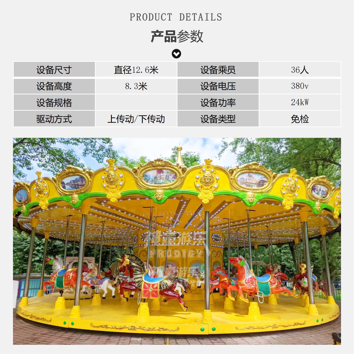 36座豪華轉(zhuǎn)馬采用夢幻飛檐、童話主題,適合公園、廣場嘉年華等主題。優(yōu)質(zhì)玻璃鋼材質(zhì),奢華外觀、華麗造型.做工精致. RGB裝飾燈,USB音樂設(shè)備 仿上驅(qū)動。 經(jīng)典的雙飛檐設(shè)計,嘉年華的動感呈現(xiàn),炫彩的燈光、華麗的造型,場地里最亮的星。