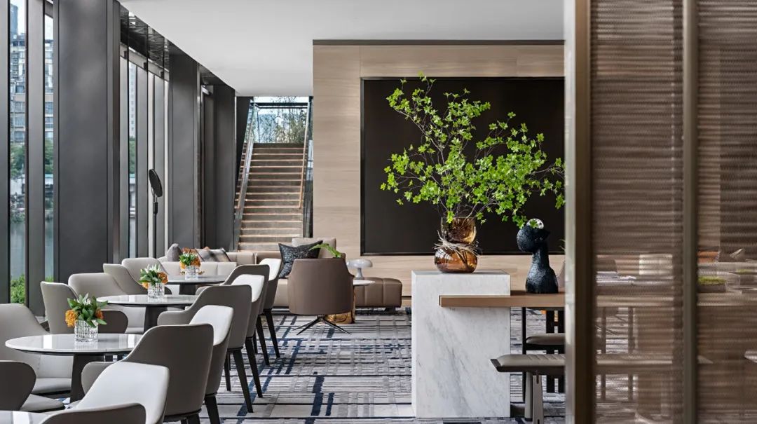 洽談區(qū)臨窗而設(shè),在自然光影與幾何燈飾的雙重綴襯下,營造著都會自然生活的美學意境,契合空間整體流露的盈盈詩意與情調(diào)。家具陳設(shè)選用大理石、木質(zhì)、皮革、軟包等質(zhì)感進行相搭,紋理間透著不凡的藝術(shù)張力,空間格調(diào)簡繁有序、相映成趣。